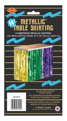 Beistle Metallic Fringe Skirt for Rectangle Tables – Banquets and Parade Float Supplies – Mardi Gras Theme Decorations, 30" x 14', Gold/Green/Purple