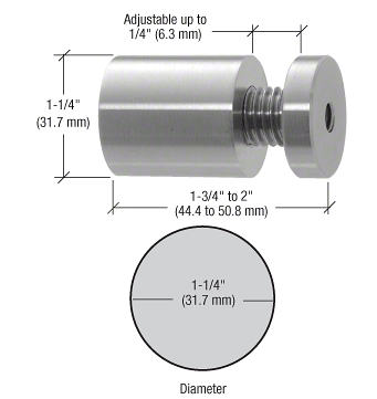 C.R. LAURENCE ASB114134BS CRL Brushed Stainless 1-1/4" Diameter Adjustable Length Standoff Base. The CRL Adjustable Standoff is primarily designed for use on uneven walls or surfaces. When the adjustment collar is in the compressed position the base measures 1-3/4" (44.5 mm) in length. When the collar is backed out an additional 1/4" (6.3 mm) is gained for a 2" (50.8 mm)length. Any length in-between is possible simply by rotating the collar to the desired measurement and securing it with the Allen set screw. Panels require a 5/8" (16 mm) hole for assembly. Does not include a Cat. No. CAP114BS Standoff Cap. Designed to be used with our 1-1/4" (31.7 mm) Diameter Standoff components.. Part Numbers Variations: ASB114134BS