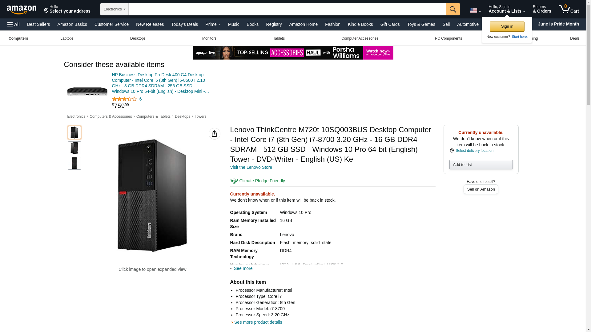 Enterprise DesktopsDependable and productive, M Series towers are a boon to any IT team. These industry-leading business machines are also stable and manageable, making them the perfect solution for any corporate rollout. Manufacturer: Lenovo Group Limited. Manufacturer Part Number: 10SQ003BUS. Brand Name: Lenovo. Product Line: ThinkCentre. Product Series: M720t. Product Model: 10SQ003BUS. Product Name: ThinkCentre M720t 10SQ003BUS Desktop Computer. Product Type: Desktop Computer. [Processor & Chipset] Processor Manufacturer: Intel. Processor Type: Core i7. Processor Generation: 8th Gen. Processor Model: i7-8700. Processor Speed: 3.20 GHz. [Memory] Standard Memory: 16 GB. Memory Technology: DDR4 SDRAM. [Storage] Total Solid State Drive Capacity: 512 GB. Optical Drive Type: DVD-Writer. [Input Devices] Keyboard Localization: English (US). [Interfaces/Ports] Total Number of USB Ports: 8. Number of USB 2.0 Ports: 4. Number of USB 3.1 Ports: 4. VGA: Yes. Number of DisplayPort Outputs: 2. DisplayPort: Yes. [Software] Operating System Platform: Windows. Operating System: Windows 10 Pro (English). Operating System Architecture: 64-bit. [Power Description] Input Voltage: 120 V AC. 230 V AC. [Physical Characteristics] Form Factor: Tower. Height: 14.4". Width: 5.7". Depth: 10.6". Weight (Approximate): 15.43 lb. [Miscellaneous] Package Contents: ThinkCentre M720t 10SQ003BUS Desktop ComputerKeyboardMouse. [Warranty] Limited Warranty: 3 Year.