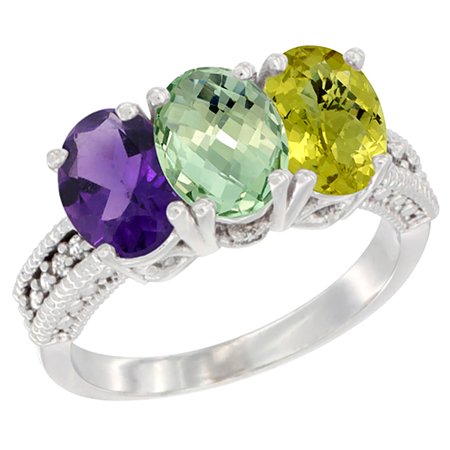 14K White Gold Natural Amethyst, Green Amethyst & Lemon Quartz Ring 3-Stone 7x5 mm Oval Diamond Accent, sizes 5 - 10
