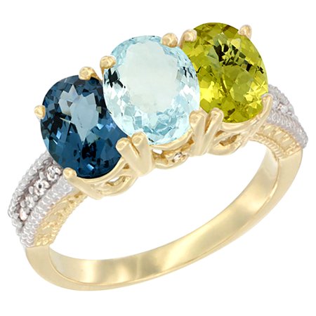 14K Yellow Gold Natural London Blue Topaz, Aquamarine & Lemon Quartz Ring 3-Stone 7x5 mm Oval Diamond Accent, sizes 5 - 10