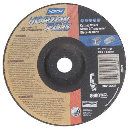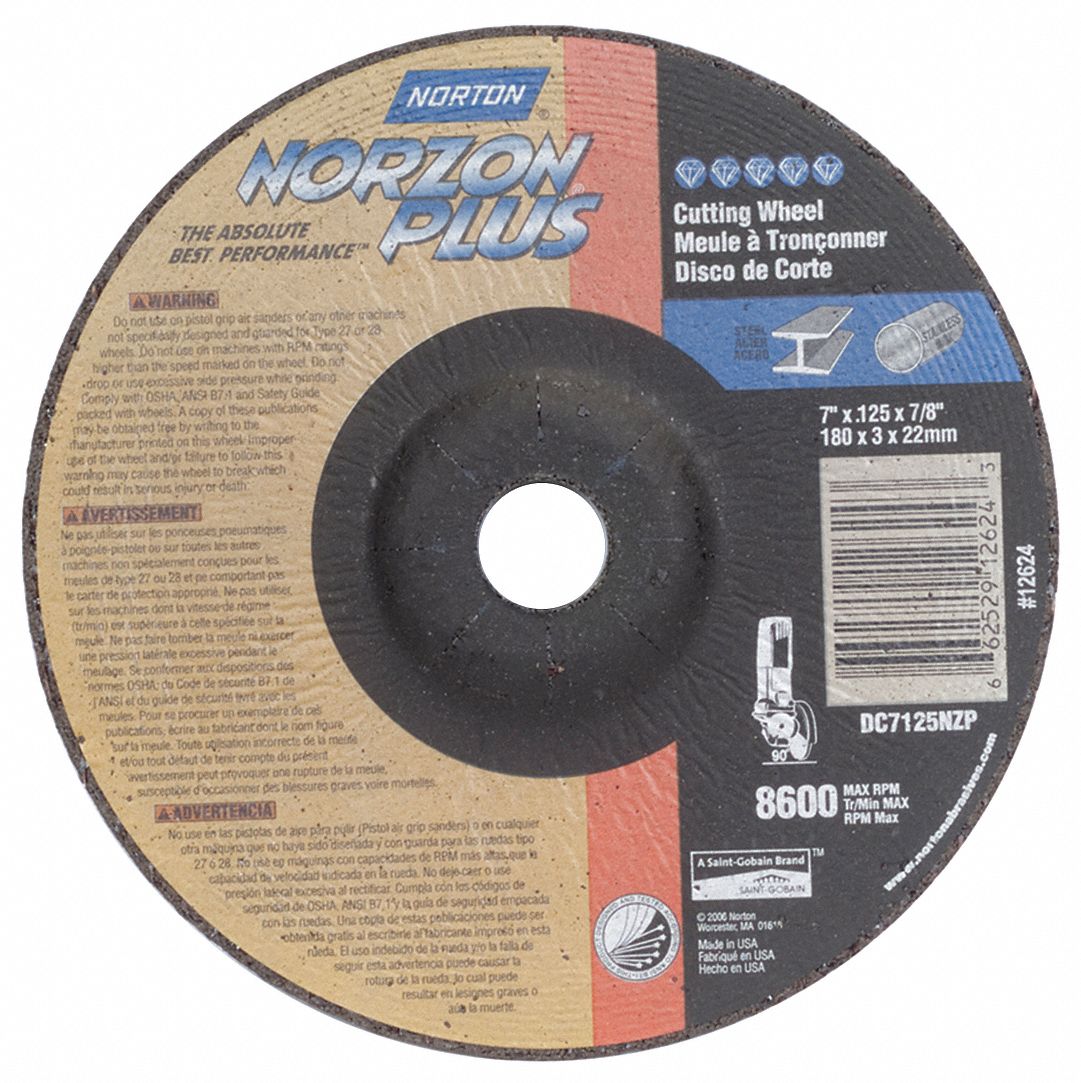 Cut-off wheel with ceramic blend abrasives for best performance.<br /><br /> Item: Depressed Center Wheels<br /> Abrasive Wheel Type: Type 27<br /> Abrasive Wheel Diameter: 7"<br /> Thickness: 1/8"<br /> Arbor Hole Size: 7/8"<br /> Abrasive Material: Ceramic<br /> Abrasive Grit: 24<br /> Max. RPM: 8600<br /> Series: NorZon Plus<br /> Grade: Extra Coarse<br /> Application: Ferrous Metal, Gray Iron, Stainless<br />