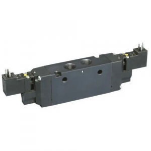 'Solenoid Air Control Valve, 4-Way, 3-Position, Closed Center Position, Actuator/Return Solenoid/Solenoid, Body Style Body Ported, Pipe Size 1/2 In., Voltage 24VDC, Pilot Port Size 1/2 In. NPT, Coefficient of Volume 5.7, 15mm, 3-Pin Male DIN Electrical Connections, Pressure Range 45 to 145 psi, Ambient Temp. Range 5 Degrees to 120 Degrees F, Override Non-Locking Flush, Overall Height 3 In., Overall Length 11 In., Overall Width 1-1/2 In., NEMA Classification NEMA 4, Standards CE, CSA, cUS'