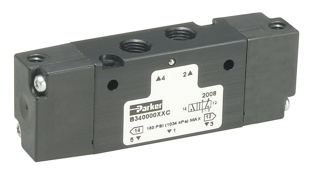 Parker Hannifin B753BB549A B7 Series Aluminum Pneumatic Solenoid 4 Way Air Control Valve, Double Solenoid, 3 Position APB, Internal Port #1/Vented, Non-Locking Flush, 15 mm 3 Pin DIN 43650C, 24 VDC, 1/2" NPT Inline Port Size