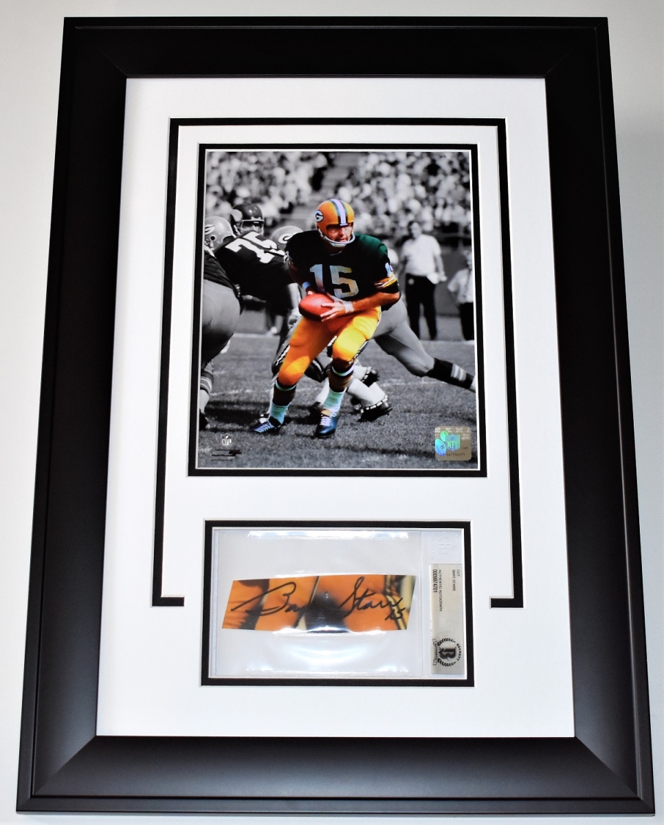 Real Deal Memorabilia BStarrFramedCut-3-BAS Bart Starr Signed - Autographed Cut Photo Custom Framed With Green Bay Packe
