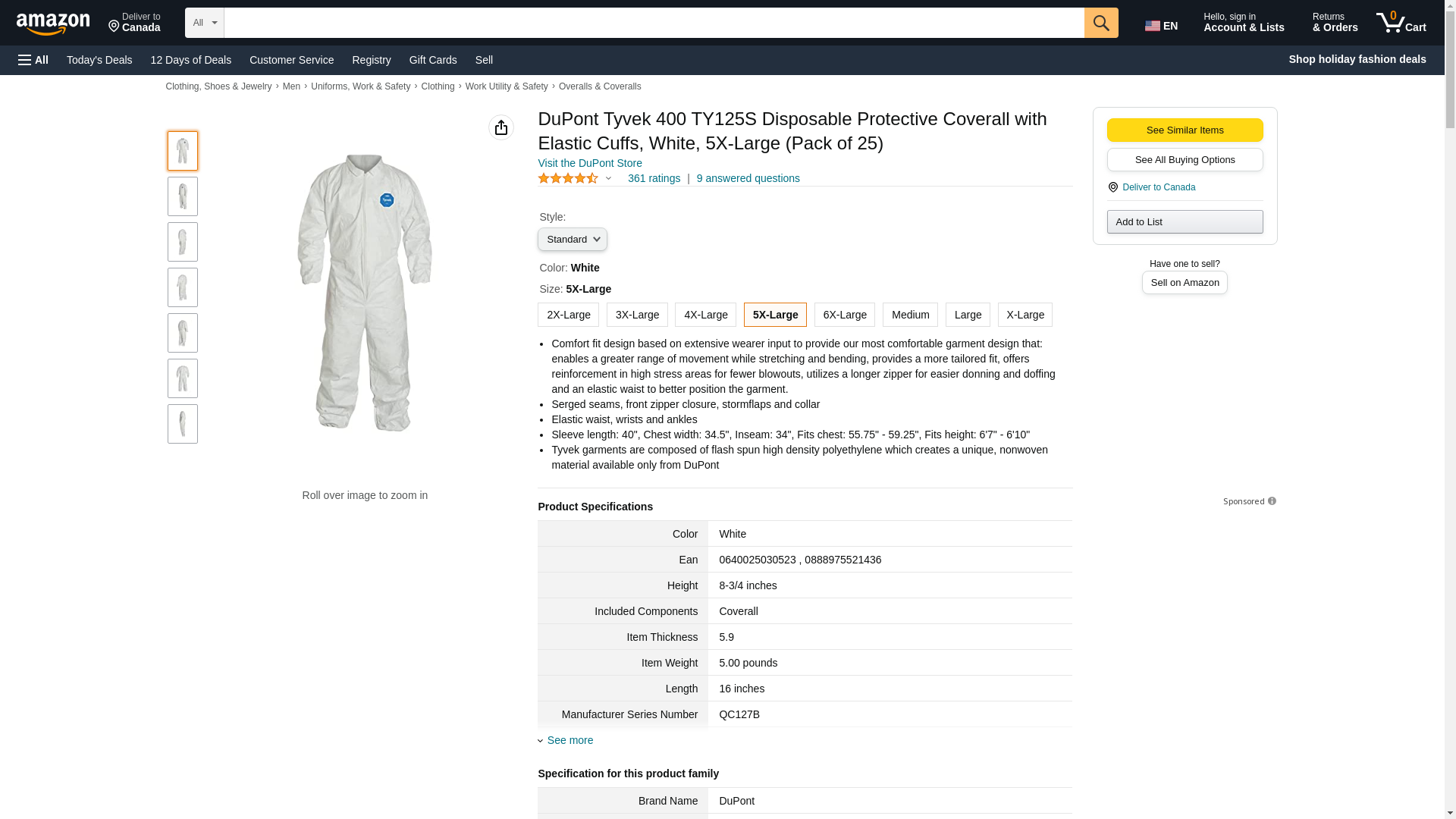 Dupont TY125SWH5X002500 Coveralls, 5X-Large, White (Pack of 25)