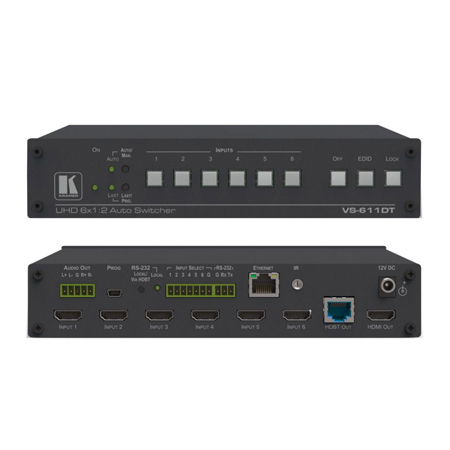 The Kramer <strong>VS-611DT</strong> is a high-performance automatic switcher for HDMI video signals with resolution up to 4K@60Hz (4:2:0). With six HDMI inputs, the unit can automatically or manually switch to a predefined or last connected input whenever the currently active video signal is interrupted or whenever a higher-priority video signal is introduced. The output signal is distributed to HDBaseT and HDMI 4K@60Hz (4:2:0) outputs.</p><p><b>Perfect for</b><br />Mid-sized meeting/conference rooms<br />Mid - to large-sized lecture rooms</p>