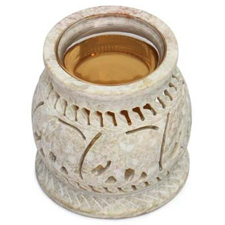Gorgeous natural soapstone color. Comes with a separate glass bowl that can be taken off. Very intricately carved latticework lets the tealight shine through. <br /> <br />The play of shadows from the light through the trellis accompanied by the beautiful aroma makes it the perfect aromatherapy diffuser. <br /> <br />Dimensions: Height: 3.5 x Diameter: 3.5. Inches.Please expect variation in color as soapstone color varies from various shades of gray to pink. <br /> <br />How to use: 1. Pour some water in the glass bowl, 2. Add some essential oil in the bowl 3. Place a tealight inside the diffuser and light it. The heat from the tea light quickly warms the water and oil, which diffuses the aroma in the air.. Caution: Keep out of reach of children and dont touch surface when lit; can get very hot! <br /> <br />