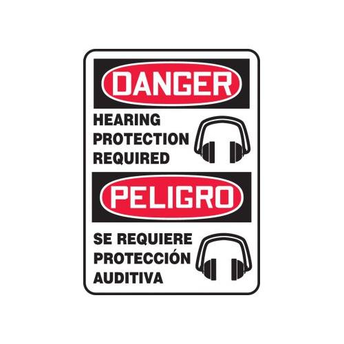 'Spanish-Bilingual Danger Sign, Subject Matter Personal Protection, English, Spanish, Legend Hearing Protection Required/Se Requiere Proteccion Auditiva, Legend Style Text and Symbol, Header Danger/Peligro, Aluminum, Height 14 In., Width 10 In., Retroreflective Grade Not Retroreflective, Legend Color Black, Background Color White, Header Legend Color White, Header Background Color Black, Red, Mounting Style With Mounting Holes, Sign Shape Rectangle'