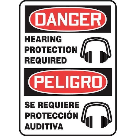 Accuform SBMPPA023VA Aluminum Spanish Bilingual Safety Sign, Legend "DANGER HEARING PROTECTION REQUIRED/PELIGRO SE REQUIERE PROTECCION AUDITIVA" with Graphic, 14" Length x 10" Width, Red/Black on White