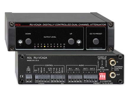 The <strong>RU-VCA2A by RDL</strong> is a full-featured studio-quality dual-channel audio attenuator module for local and/or remote control of balanced or unbalanced line-level sources. Each module can be remote controlled from a single or multiple locations. Rear-panel terminals provide flexible control options using a variety of RDL remote controls or OEM equipment.</p><p>Audio levels are controlled in 0.5 dB steps using noiseless zero-crossing digital attenuators for optimum reliability, precise tracking and long-term click-free service. Exceptional wide-band low-noise performance makes the RU VCA2A suited to level adjustment in the most demanding applications. Rear-panel inputs and outputs may each be wired balanced or unbalanced. The RU-VCA2A powers up in one of two operating modes set by a rear-panel switch.</p><p><strong>MOM (momentary) Mode</strong><br />In the MOM (momentary) mode, audio level is controlled by momentary pushbuttons or pulses. Remote terminals and front-panel pushbuttons are provided for up and down ramping control. If either button is held in, the audio will ramp automatically. If a button is pulsed (< 0.5 second), the audio will increment one step. The time of both the UP and DOWN ramps is individually adjustable on the front panel. Pushing remote UP and DOWN buttons simultaneously, or pressing the front-panel GO TO PRESET button, returns the audio to a preset level. The preset level is stored by adjusting the desired level using the UP and DOWN buttons, then pressing and holding the front-panel PRESET button for 3 seconds. A rear-panel switch sets the audio power-up level to either the preset level or the last level setting used. Multiple remote control locations are possible in the MOM mode. External control pulses may be either of positive polarity or pulled-to-ground (open-collector).</p><p><strong>0 to 10 VDC Mode</strong><br />In the 0 to 10 VDC mode the preset function is disabled and the audio level is controlled by a remote 10 kΩ linear taper pot or by 0 to 10 Vdc. A single remote control location is possible using a remote 10 kΩ pot.</p><p>In both operating modes, two separate 0 to 10 Vdc outputs are provided. The linear RAMP output drives the level display on RDL remote controls; the EQ RAMP output is used to control an automatic RDL Loudness Equalizer (see ST LEQ1). A front-panel 10-LED string display indicates the relative audio level. Control expansion is possible using the EXTERNAL CONTROL DATA jacks. One module can be set as a MASTER module to control the level of one or more additional RU-VCA2A or RU VCA6A modules set to the SLAVE mode. Use the RU-VCA2A individually, or combine it with other RDL products as part of a complete system.</p>