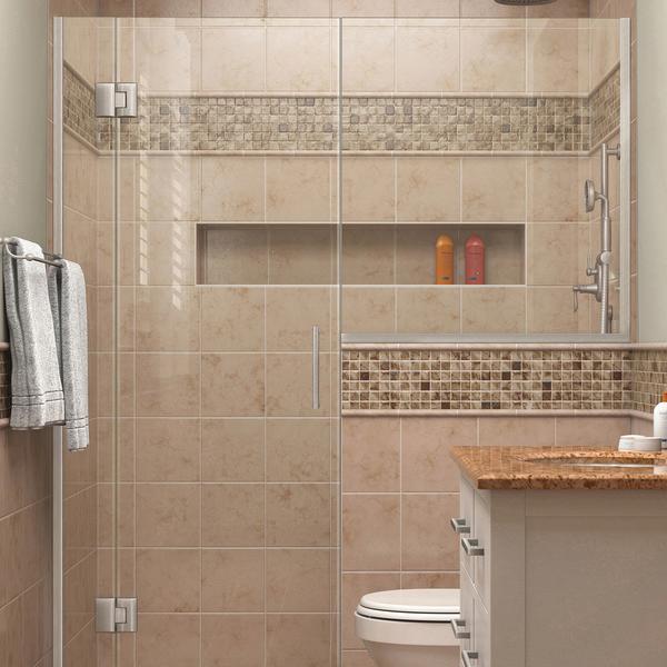 | Feature | Clear 3/8 in. (10mm) thick ANSI certified tempered glass. Reversible for left/right wall installation. Brushed Nickel finish |