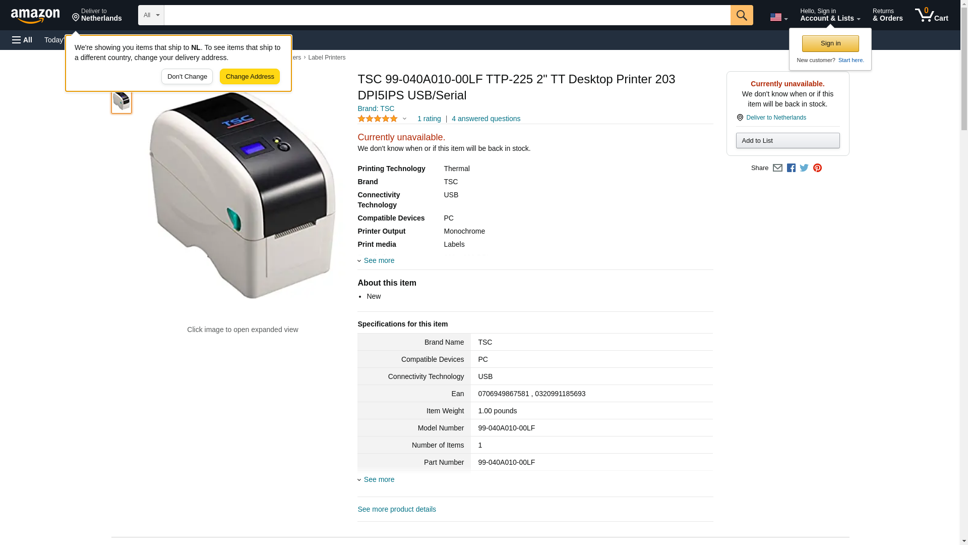 TSC Auto ID - 99-040A010-00LF - Tsc, Ttp-225, Printer, 203 Dpi, 5 Ips, 4 Mb Flash, 8mb Dram, Rtc, Usb, Serial, Includes