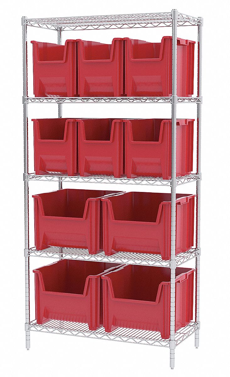 Akro-Mils AWS1836SNSR Wire Bin Shelving System with 5 Shelves and Stak-N-Store Red Bins, 36-Inch x 18-Inch x 74-Inch, Chrome