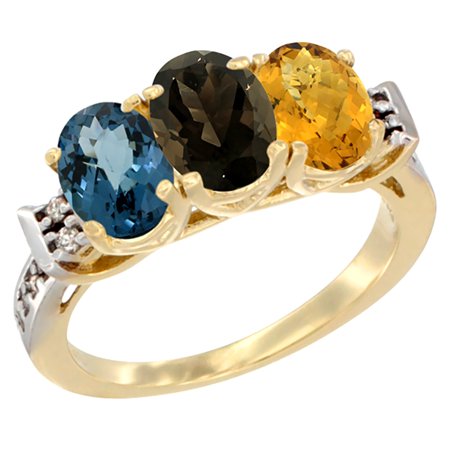 10K Yellow Gold Natural London Blue Topaz, Smoky Topaz & Whisky Quartz Ring 3-Stone Oval 7x5 mm Diamond Accent, sizes 5 - 10