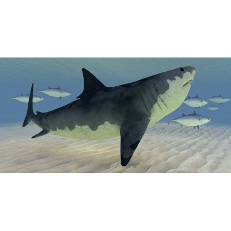 A school of swift swimming bluefin tuna fish provoke the curiosity of a Great White Shark Poster Print