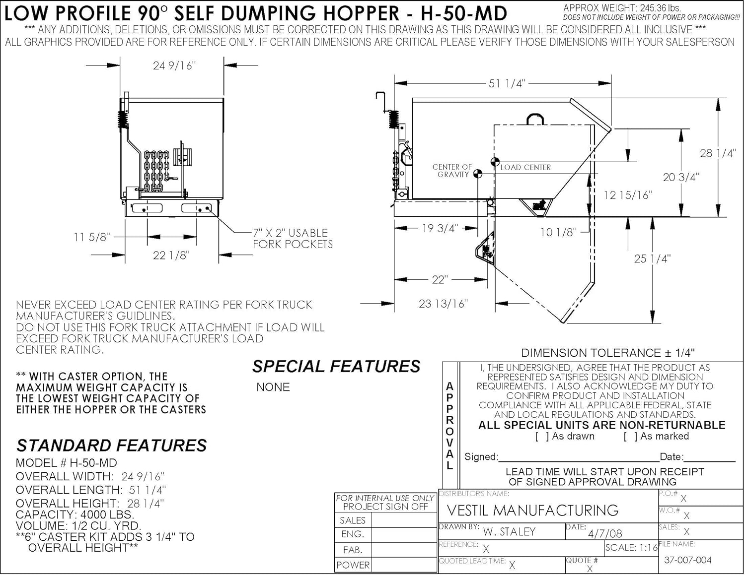 Vestil H-50-MD-GAL Self Dumping MD Hopper, 0.5 cu. yd., 4000 lb. Capacity, 51.25" Length, 24.6875" Width, 28.25" Height