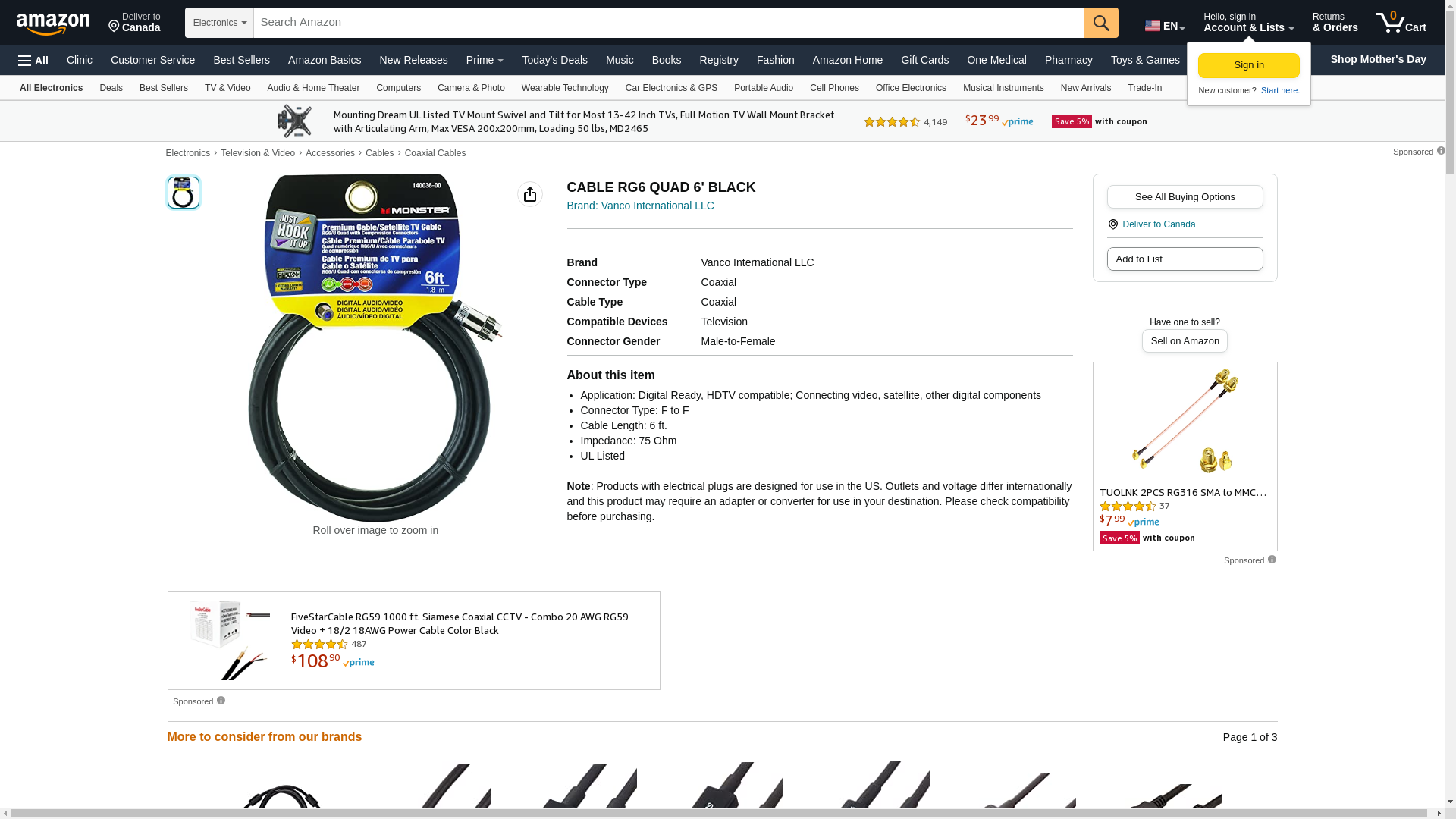 Monster Cable Video Coaxial Cable Digital 75 Ohm 6 ' Carded