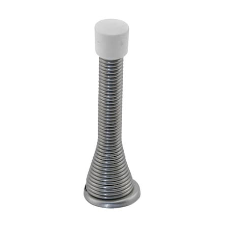 These heavy-duty door stops are constructed of spring steel wire and come in a satin nickel plated finish. They feature a separate mounting base and screw to allow for use of longer screws where broken baseboards are a problem. These door stops also feature flexible wire construction with a 3 in. reach, and a rubber tip to cushion and prevent unwanted damages to adjacent walls. The mounting bases of these door stops have a large 7/8 in. outside diameter. Door stops like these are easy to install and are used by many. <li>Used to prevent door handle of opening doors from hitting and damaging adjacent wall </li><li>Spring steel wire construction with rubber tip </li><li>Rubber tip prevents damage to door by cushioning impact</li><li>Includes steel screw insert affixed to bottom </li><li>Mounting base allows for use of longer screws when installing on thick baseboards</li><li>Mounts at bottom of walls over baseboard</li><li>A Phillips head screwdriver is required for Installation</li><li>For further dimensional information, please see the line drawing</li>