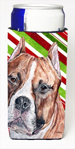 Caroline's Treasures SC9800MUK Staffordshire Bull Terrier Staffie Candy Cane Christmas Ultra Hugger for slim cans Can Cooler Sleeve Hugger Machine Washable Drink Sleeve Hugger Collapsible Insulator Be