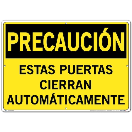 Vestil Caution Sign SI-C-67-E-AC-130-S Aluminum Composite .130" overall size 20.5"W x 14.5"H THESE DOORS CLOSE AUTOMATICALLY, ESTAS PUERTAS CIERRAN AUTOMÁTICAMENTE