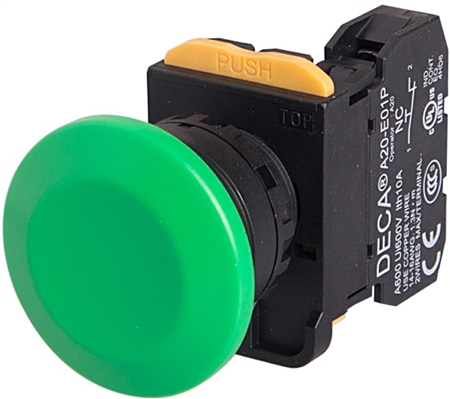 Deca A20B-M4E01G 22 mm momentary push button has a green mushroom head with a 1NC contact arrangement. Not illuminated. Rated IP 65
