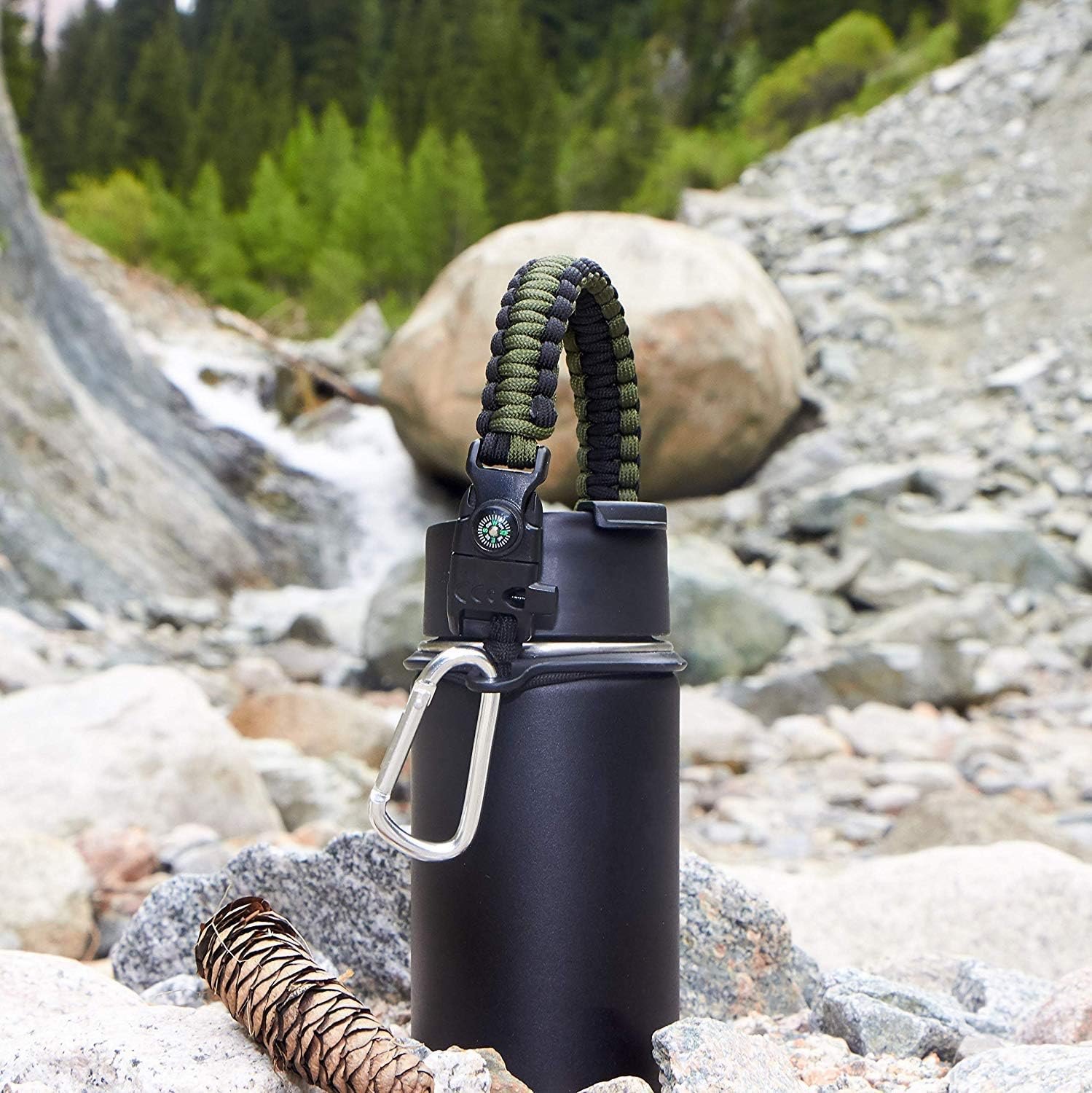WaterFit Paracord Carrier Strap Cord with Safety Ring and Carabiner for 12-Ounce to 64-Ounce Wide Mouth Water Bottles, ArmyGreen/Compass+FireStarter