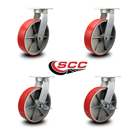 Listing is for a set of four (4) Service Caster Series #92 casters with a 10" diameter, 3" wide red polyurethane tread on metal core wheels. Set includes four (4) swivel casters, two (2) fitted with side locking brakes. Supports 12000 total pounds (lbs) at 3000 pounds (lbs) per caster.When searching for a reliable and durable solution for extra heavy duty projects, consider Service Caster’s Series 92 top plate polyurethane on metal wheel casters. The Service Caster Series #92 is ideal for material handling, carts and industrial equipment. The non-marking, non-marring polyurethane tread performs especially well on hard surfaces such as concrete, tile, and wood, while the metal core wheel stands up to heavier loads with a stable and secure roll. Featuring a Kingpinless hot forged ASTM1045 steel design that increases caster durability and integrity, the series 92 eliminates problems associated with kingpin failure due to severe shock loading. In addition, the Kingpinless design features ½” diameter HRC45 steel ball bearings which absorb thrust and load in severe environments. Lastly, Service Caster’s Series #92 top plate casters are finely crafted with zinc plating, grease fittings, and 4 position notches to accept 4-position locks. These highly versatile casters are ideal for a wide range of applications, such as dollies, platform trucks, warehouse carts and freight terminals. Even drywall carts, welding carts, and wall panel carts will be ready to roll on the Series 92, keeping you moving forward. Service Caster is unsurpassed in quality, reliability, and excellent customer service. Count on us to move you forward.