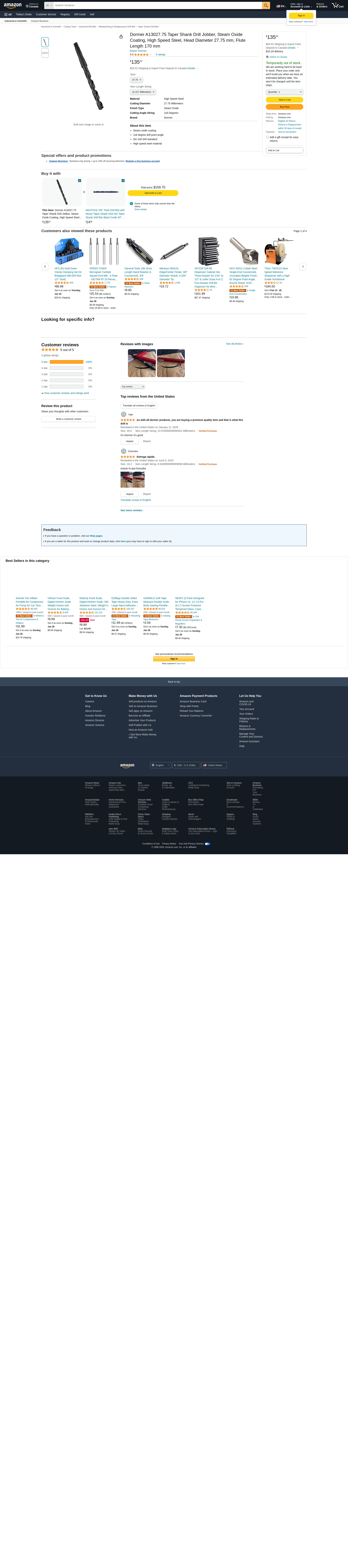Dormer A13027.75 Taper Shank Drill Jobber, Steam Oxide Coating, High Speed Steel, Head Diameter 27.75 mm, Flute Length 170 mm