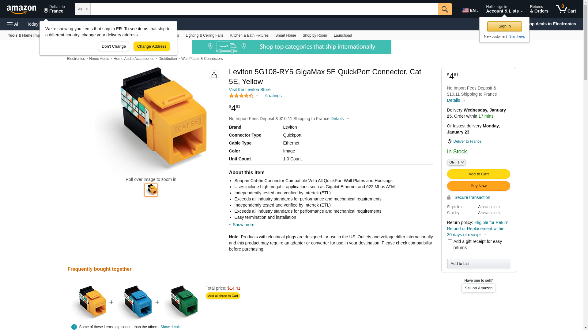 Leviton's Gigamax Cat5e Keystone Jacks are designed and manufactured to the highest standards. The rear 110 type IDC terminations have a dual-row layout. The rear profile is narrow enough to fit high-density patch panels. Color-coded wiring labels show T568A and T568B wiring patterns. Features: Manufacturer: Leviton Connector: RJ45 Rear Termination: 110 type IDC Color: Yellow Meets EIA/TIA Cat5e Standards TSB 568A or 568B UL-Listed Wall Plates & Jacks > Voice & Data Jacks > Cat5e Jacks, Wall Plates & Jacks > Voice & Data Jacks > Cat5e Jacks 5G108-RY5
