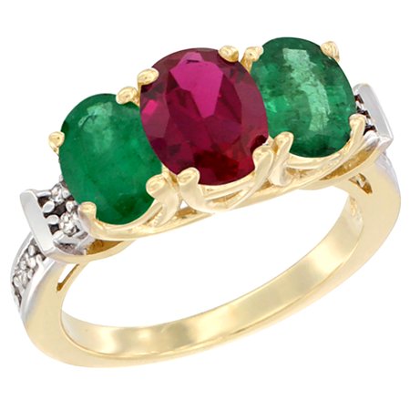 10K Yellow Gold Enhanced Ruby & Emerald Sides Ring 3-Stone Oval Diamond Accent, sizes 5 - 10