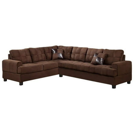 Wrapped in smooth and plush microfiber with seating for large family and friend gatherings, this two-piece sectional is constructed in pure modern flare. Its light asymmetric stitching on the back and seat cushions work perfect with the two-toned accent pillows . Available in chocolate and saddle.Color: chocolateIncludes 2-piece sectional sofa set with 2 accent pillowsMade of solid pine wood and plush microfiberWooden frame covered in microfabricSeat cushion filled with foam and pocket coil for comfort and durabilityTufted seat and backContemporary styleU.S. patented reversible designSpecifications: Overall Product Dimension: 35"H 112"W 87"D Weight:210lb
