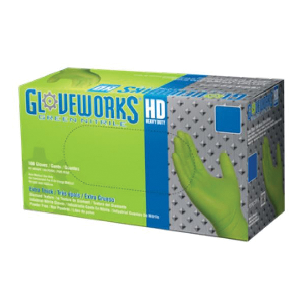 GLOVEWORKS HD Industrial-Grade 8 Mil Green Nitrile Gloves are sure to be your new favorite disposable glove! What makes Gloveworks heavy-duty nitrile gloves special? Three words: raised diamond texture. Those little bumps provide 60% more surface area and channel away liquid so you can always hold on tight, even when the gloves are wet. The reverse texture on the inside helps air circulate to keep your hands drier. At 8 mils thick and measuring 9.5" from fingertip to cuff, the gloves deliver three times the puncture resistance of latex, as well as excellent protection against chemicals, making them the perfect mechanics gloves. Disposable, latex free, and powder-ree they are ideal for longer duration use, The high-visibility color demands to be seen, an important safety factor in dark environments. Commonly bought by those looking for mechanic gloves disposable, cooking gloves disposable food safe, industrial applications, dishwashing, household cleaning, and food services uses. Sold in sizes Medium to XX-Large, 100 gloves per box, 10 boxes per case. * With the added texture, this glove runs small, consider ordering a size larger than usual.