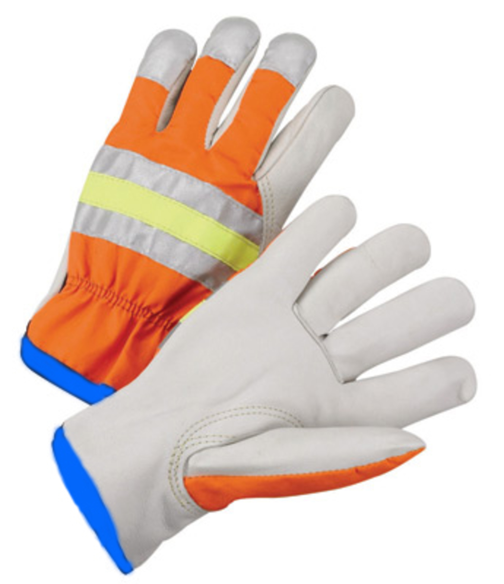 Radnor unlined cowhide drivers glove with Hi-Viz orange back is a premium grade top grain leather with a keystone thumb. The back is made of fluorescent orange polyester with a 2.1" 3M Scotchlite reflective silver fabric trim stripe with a 3/4" green band in the middle. (Purchase of 4 Pairs)