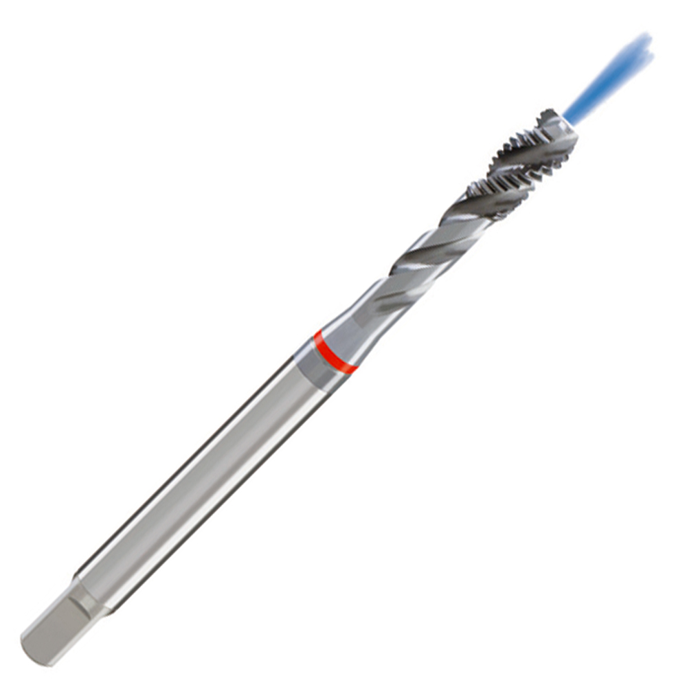 M5 x .8 Red Ring Spiral Flute Semi-Bottom DIN 371 Standard Tap, HSS-E (Cobalt), D3/D4, Bright Finish, Coolant Fed Type: Red Ring,Number of Flutes: 3,Hole Type :Blind Hole 70mm Overall Length, 6mm Shank Diameter, 25mm Threading Depth, With Axial Coolant Through, Chamfer Form C: 2 to 3 Lead Threads Series No. 1894, Order Code 05.0000, Guhring Part #9018940050000