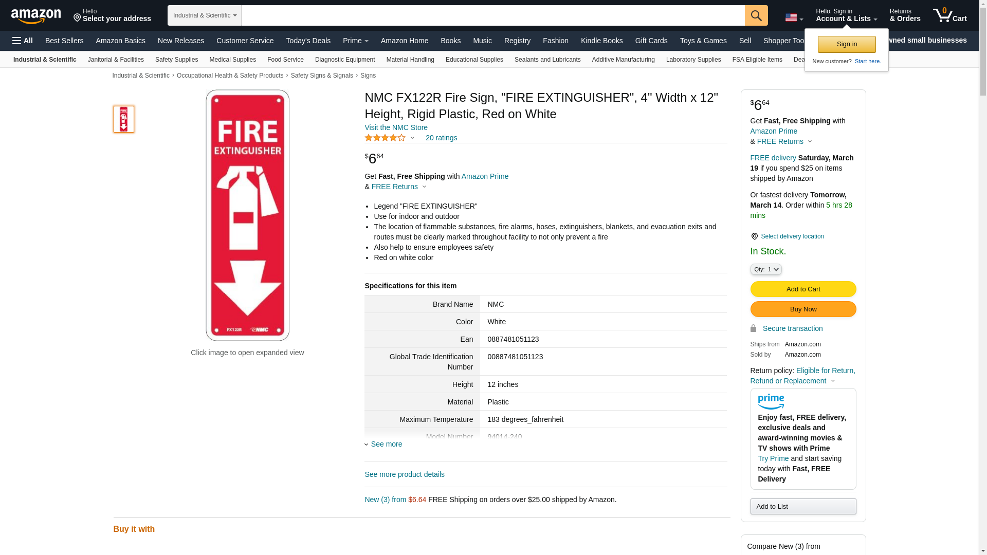 NMC FX122R Fire Sign, "FIRE EXTINGUISHER", 4" Width x 12" Height, Rigid Plastic, Red on White