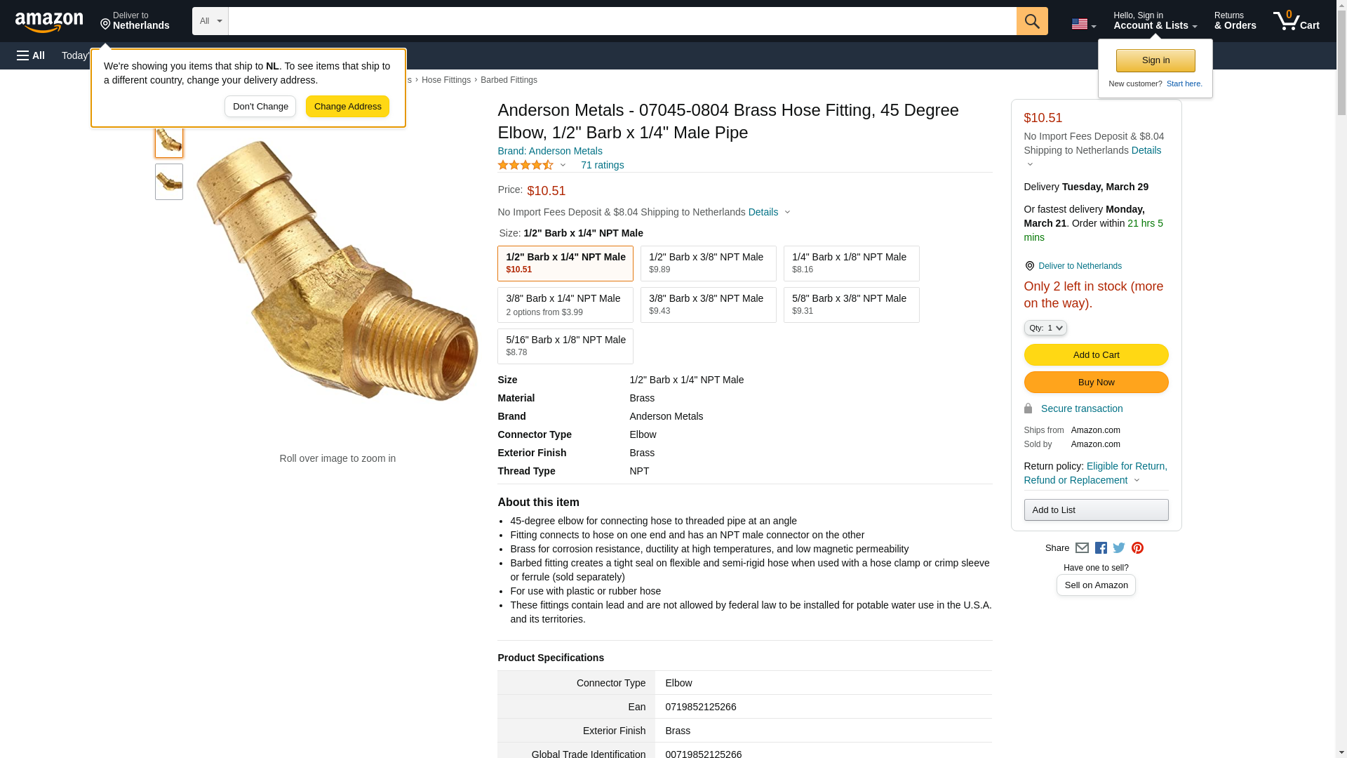 Anderson Metals Brass Hose Fitting, 45 Degree Elbow, 3/8" Barb x 1/8" Male Pipe