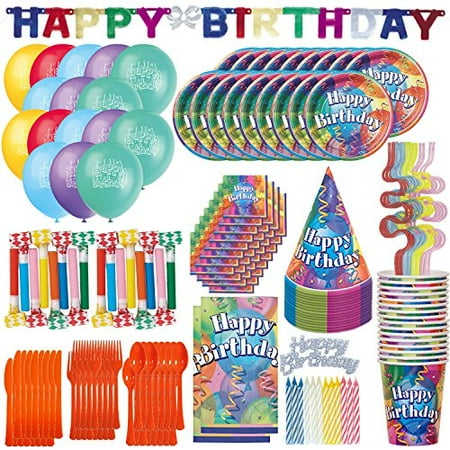 <p><strong>Everything you need for a birthday party. Just add a birthday cake and food.</strong></p> <ul> <li>16 happy birthday 7 inch paper plates</li> <li>16 happy birthday 9 ounce paper cups</li> <li>32 happy birthday napkins</li> <li>16 plastic spoons</li> <li>16 plastic forks</li> <li>16 plastic knives</li> <li>16 hard squiggle straws</li> <li>2 happy birthday plastic table covers - 84" x 54"</li> <li>1 large happy birthday banner</li> <li>16 birthday hats</li> <li>16 happy birthday balloons</li> <li>16 party blowout whistles</li> <li>1 happy birthday cake topper</li> <li>12 birthday candles with 12 holders</li> </ul> <br /> <br />