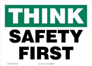 7" x 10" Aluminum Sign: "Think - Safety First" Remind all workers and readers to think of safety and safe habits first. Aluminum (VA) Aluminum withstands wash downs, harsh elements, abusive conditions, and features good chemical, abrasion, and impact resistance. Aluminum is excellent for indoor and outdoor usage, making it ideal for a wide variety of industrial-strength applications. All Aluminum signs feature Accuform's TedLex liquid-based UV-protective coating, included at no charge. TedLex is perfect for indoor and outdoor use, prevents fading, and resists chemicals, abuse, and graffiti. Aluminum signs provide the strength of metal, yet never rust. Aluminum withstands wash downs, harsh elements, and abuse.
