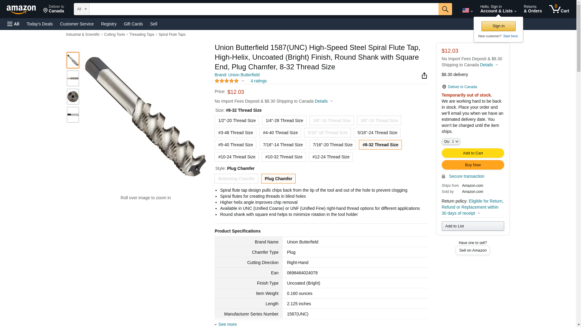 Union Butterfield 1587(UNC) High-Speed Steel Spiral Flute Tap, High-Helix, Uncoated (Bright) Finish, Round Shank with Square End, Bottoming Chamfer, 8-32 Thread Size