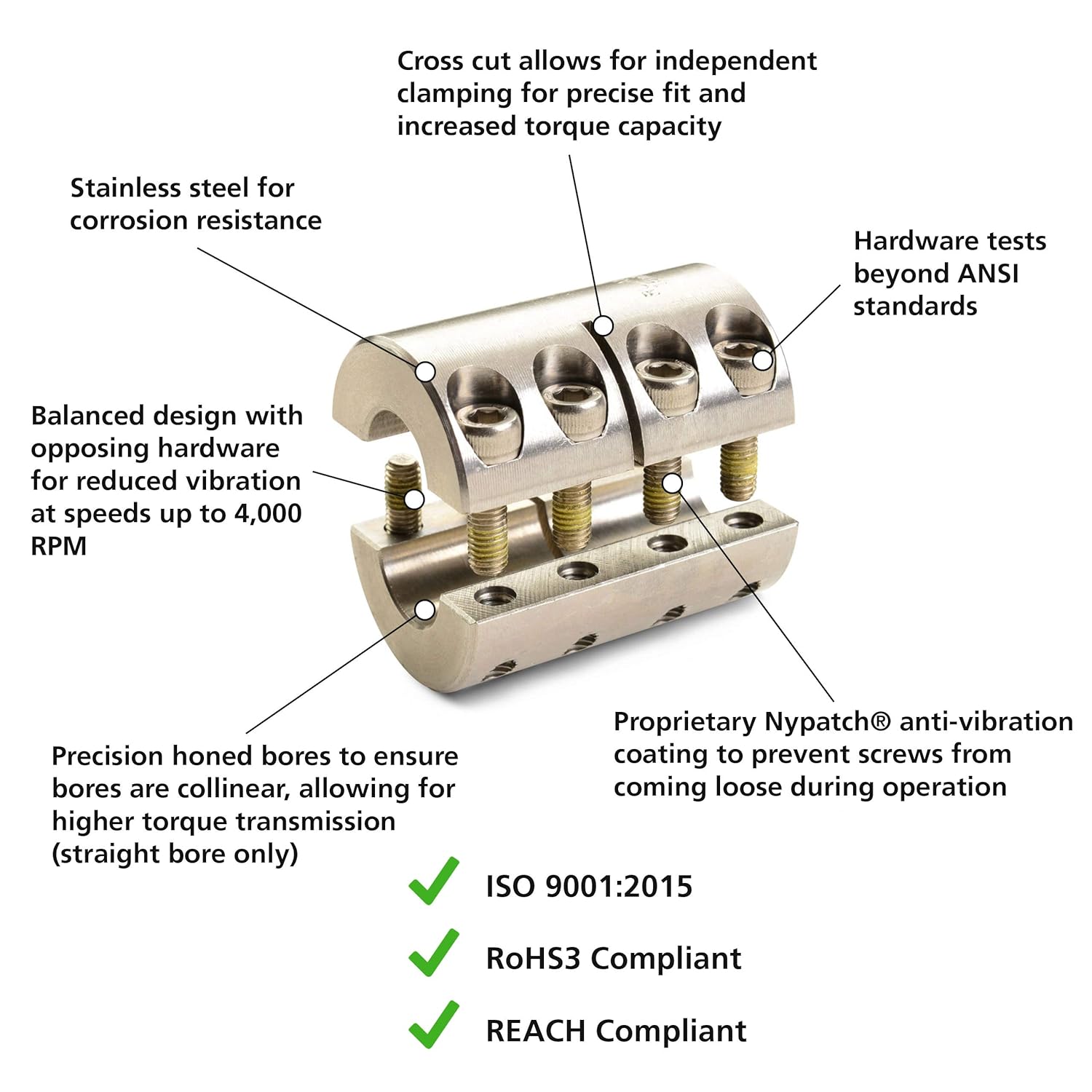 Ruland SPX-19-19-SS Two-Piece Clamping Rigid Coupling, Stainless Steel, 1-3/16" Bore A Diameter, 1-3/16" Bore B Diameter, 2-1/16" OD, 3-1/4" Length