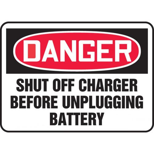 OSHA Safety Signs - DANGER: Shut Off Charger Before Unplugging Battery, 10" x 14". Two-ply, poly-carbonate plastic with industrial-strength backing. Resists fading, chemicals, corrosion, abrasions, cracking, and chipping. Non-glare reverse and subsurface print encapsulated by permanently bonded embossed poly surface. <br>Rounded corners and 1/4" mounting holes on most sizes. Service temperature range: Poly-carbonate at -60 to 260 F; backing -40 to 176 F.<br><br>Accu-Shield is the highest performance sign material, with an extended 15-year outdoor durability guarantee. The non-glare polycarbonate plastic is specially formulated to resist color change, chemicals, corrosion, vandalism, and abrasions - and will continue to look good for years while maintaining its superior strength. The two-ply, heavy-duty construction provides a rugged yet stylish appearance.<br><br>The legend and message are reverse-printed with UV resistant inks on the underside of the clear polycarbonate. This sub-surface image is sealed with further protection on the backside by a permanently bonded, laminated poly sheet. A composite sign, .189" thick, will not crack, chip, fade, or become brittle under extreme environments. Use indoors and outdoors. with service temperature range for poly-carbonate at -60 degrees to 260 degrees F. and under layer surface -40 degrees to 176 degrees F.