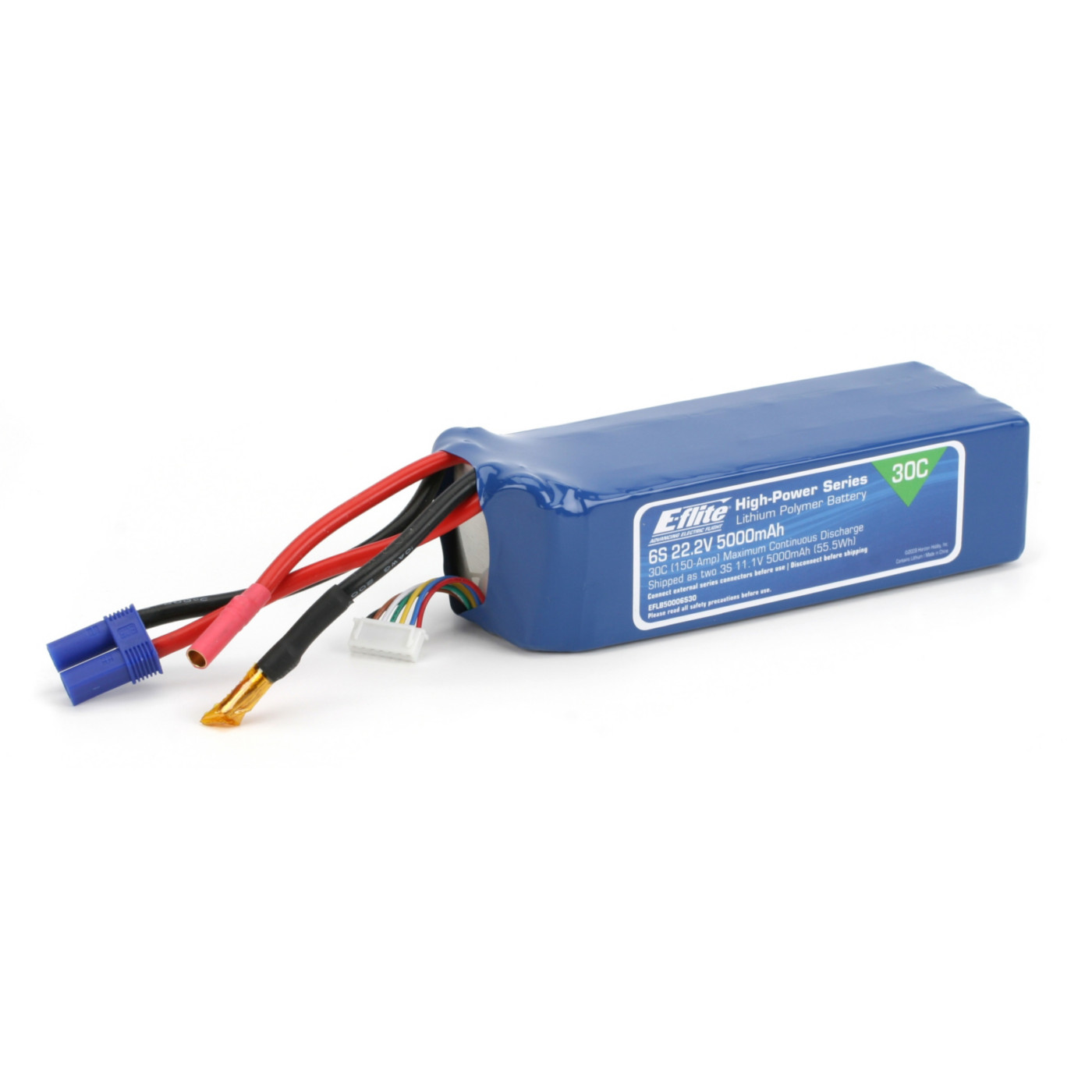 <div style="margin: 1em"><p>== Key Features ==<br><br>* Capable of maximum continuous discharge rates up to 30C<br>* Equipped with balancing leads and a connector that are compatible with most balancers and balancing chargers<br>* Equipped with an E-flite EC5 connector on main power leads<br>* Ideal for use in 60-size airplanes using Power 60 outrunner, large (90mm or larger) ducted fans for higher power setups, or 600-size helis<br><br>== Overview ==<br><br>E-flite High-Power Series Lithium Polymer Batteries offer an excellent blend of weight, power and performance. Available in a wide variety of capacities and voltages, there's a battery perfect for almost any application, from indoor slow flyer to large-scale sport and aerobatic airplane models as well as micro to mid-sized helicopter models. <br><br>Please Note: In order to comply with shipping regulations and safety, this 6S 5000mAh battery is equipped with external series wire leads with gold bullet connectors that are shipped disconnected so the pack is considered as two 11.1V packs connected in series. You are required to connect the series wire leads before first use by connecting the two bullet connectors in order for this pack to properly operate as a 22.2V pack. <br><br>Before shipping this pack for any reason in the future, you will need to disconnect the series leads first. <br><br>WARNING: Lithium Polymer (Li-Po) batteries come partially charged and are significantly more volatile than the alkaline, Ni-Cd or NiMH batteries used in RC applications. Keep batteries out of reach of children, unless supervised by a responsible adult. All interactions and warnings found on the sheet inside of this cad must be followed exactly. Mishandling of Li-Po batteries can result in a fire. <br><br>Before handling and fir