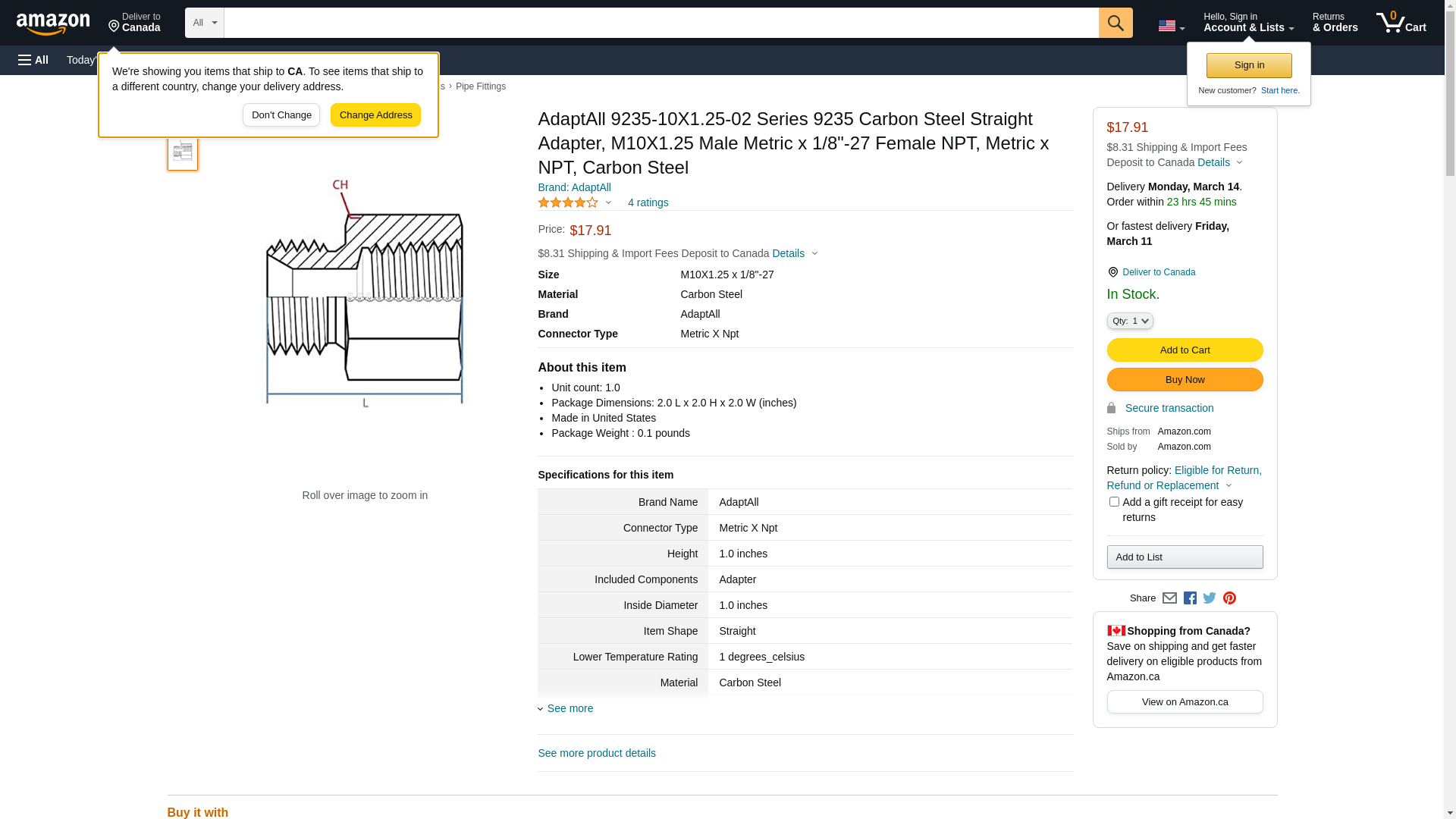 AdaptAll 9235-10X1.25-02 Series 9235 Carbon Steel Straight Adapter, M10X1.25 Male Metric x 1/8"-27 Female NPT, Metric x NPT, Carbon Steel