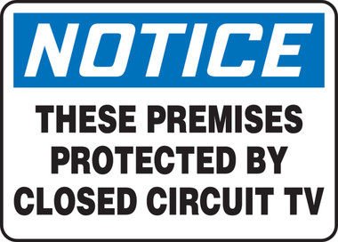 Accuform MASE831VP, 7" x 10" Plastic OSHA Sign with Legend: "These Premises Protected By Closed Circuit TV" Prevent theft and vandalism by alerting others of video surveillance. Sign prevents vandalism and theft by alerting others of security protocols employed in the area Traditional OSHA-style signs, tags and labels are the most widely recognized design format in the industry Notice header indicates information considered to be important but not hazard-related Plastic (VP) - Plastic combines standard, reliable performance with 92% recycled content to create a dependable, Earth-friendly material solution. Semi-flexible, impact-resistant plastic signs are ideal for standard-duty use -- for installation indoors and for protected, short-term outdoor applications. Get the look, feel and characteristics of non-recycled plastic signs in an environmentally friendly version.