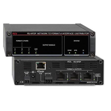 The RU-NFD modules are Dante audio network interface products compatible with RDL Format-A twisted pair products. These modules are designed to be mounted in equipment racks, closets, conference tables and on shelves or backboards in commercial/industrial installations.</p><p>APPLICATION: The RU-NFD is an RDL Format-A sender/distributor that connects to a Dante-enabled network. It converts three Dante audio channels to RDL Format-A. Each network channel corresponds to Pair A, B or C of the Format-A outputs. The unit converts a fourth Dante audio channel to a balanced line-level AUX output.</p><p>One front-panel green signal LED corresponds to each of the four Dante input channels. Received audio level is indicated on the variable-intensity LED indicator, facilitating setup when a networked computer is not connected at the module?s location.</p><p>The Format-A output is distributed to three separate rear-panel RJ45 jacks. Each Format-A output jack provides up to 200 mA of power to connected Format-A receivers. Multiple receivers may be daisy chained from one output jack, or may be connected by home run to each of the three outputs. Higher current Format-A receivers, such as RDL D-PSP1A powered Decora-style speakers, are to be individually connected to a separate output jack.</p><p>The RU-NFD output jacks support the entire range of Format-A receivers, making each output pair available for end-user connection on various wall plates, or feeding other equipment using rack-mounted, shelf-mounted or utility Format-A receivers. The wide array of Format-A receivers provide compatibility with commercial audio equipment operating at standard professional levels. High resolution digital audio converters coupled with RDL?s renowned analog filters provide superior fidelity with a very low noise floor. Each Format-A receiver may be connected near the RU-NFD or up to several thousand feet distant.</p><p>The RU-NFD is powered from an external 24 Vdc power supply, available separately. The external supply powers the RU-NFD and Format-A receivers connected to all three Format-A outputs. The RU-NFDP is equipped for PoE which powers the RU-NFD and Format-A receivers connected to the primary Format-A output jack. Audio is also distributed to the other two output jacks. Remote Format-A receivers connected to those other two output jacks are only powered from the RU-NFDP if an external 24 Vdc power supply is connected. If PoE power and an external 24 Vdc supply are both feeding an RU-NFDP, the unit will run from the external supply and will seamlessly switch over to PoE power upon loss of the external 24 V supply. The power feeding each Format-A RJ45 connector is separately protected by an automatically resetting fuse. A power LED is associated with each connector, facilitating identification of wiring faults.</p><p>PoE relies on the use of a PoE enabled network switch. The RU-NFDP will reserve power from the switch even while being powered from an external 24 Vdc supply.</p><p>The RU-NFD is constructed in a durable, professional all-metal enclosure suitable for free-standing, surface-mounted or rack-mounted operation. This full-featured product is engineered and manufactured in the U.S.A for continuous duty in demanding installations. Built to last. Built to outperform.</p>