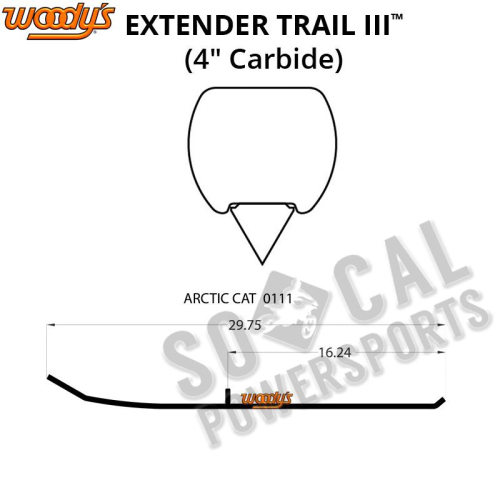 Woodys most popular carbide.<br> 4in. turning carbide that has a sharp.<br> 60deg. edge angle for performance cornering; 1 1/2in. carbide wear pads help extend runner life.<br> Full-length hardweld surfaces between all three carbide inserts for total wear protection.<br> Extra-long studs make it easy to mount plastic ski skins.<br> Sold in pairs.