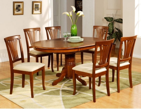 - Leaf Feature Dining table features a built-in 18 inch self storage extension leaf which can be stored right beneath table the top; Includes 7 Piece Dining room table and kitchen dining chairs are available in an alluring Saddle Brown finish and Six Microfiber Upholstered seat chairs.; Table Size 42x60 Oval