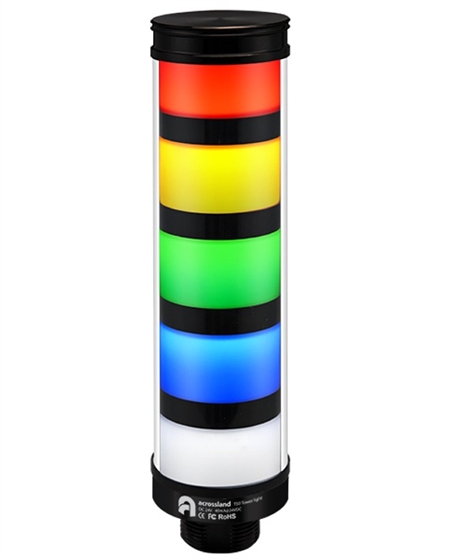 Qronz T50-NRYGBW-LN12 5 stack LED tower light has a 52 mm diameter. 12V DC. Red yellow green blue & white. Lead wire connection. Pole & bases sold separately