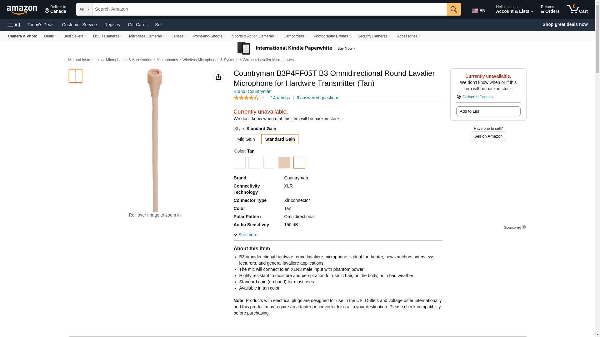 Countryman B3P4FF05T, Hardwired/XLR, (P4) Standard gain for most uses, (T) Tan, B3 Omnidirectional Lavalier Microphone